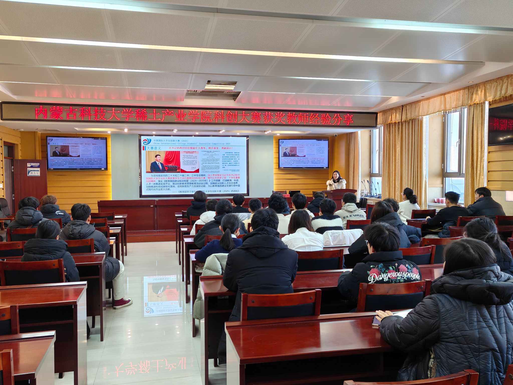 许欣老师围绕 “沙漠碳库” 项目的挖掘、培育及获奖历程展开,详细介绍了该项目聚焦荒漠化治理瓶颈,构建固沙保水促生一体化生态治理技术体系,以国际首创 3D 沙漠碳捕集与碳封存一体化方案斩获国赛银奖的全过程,并分享了项目运作与参赛备赛核心技巧。她鼓励同学们立足专业、关注社会需求,勇于投身科创实践与赛事比拼。现场老师们就提升参赛质量展开深入研讨交流。